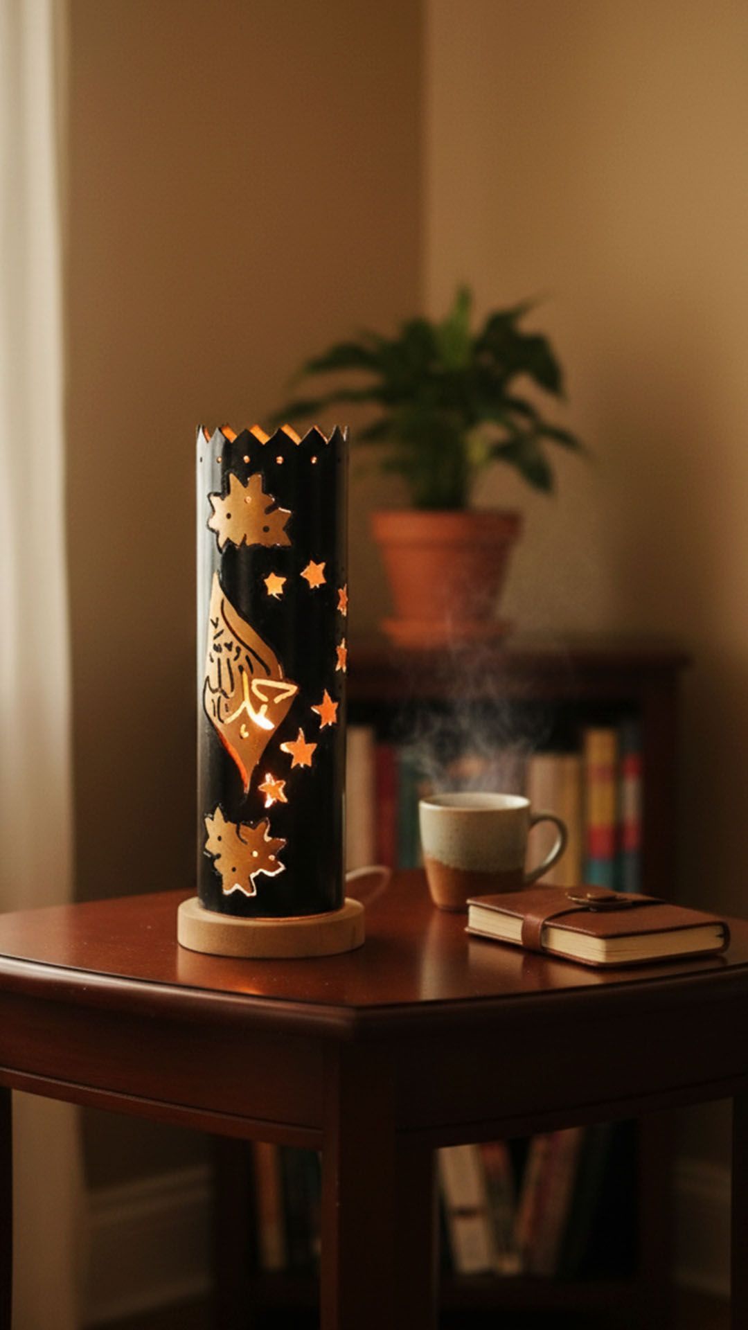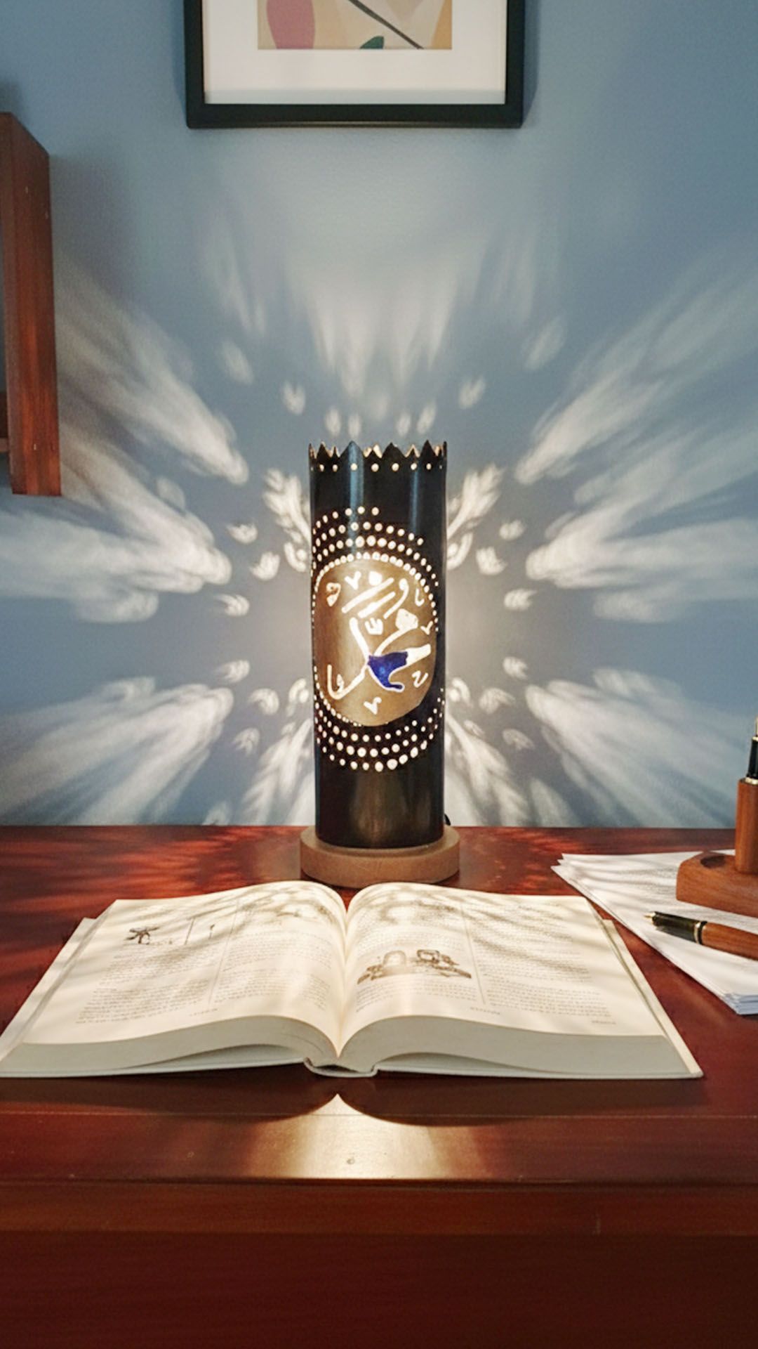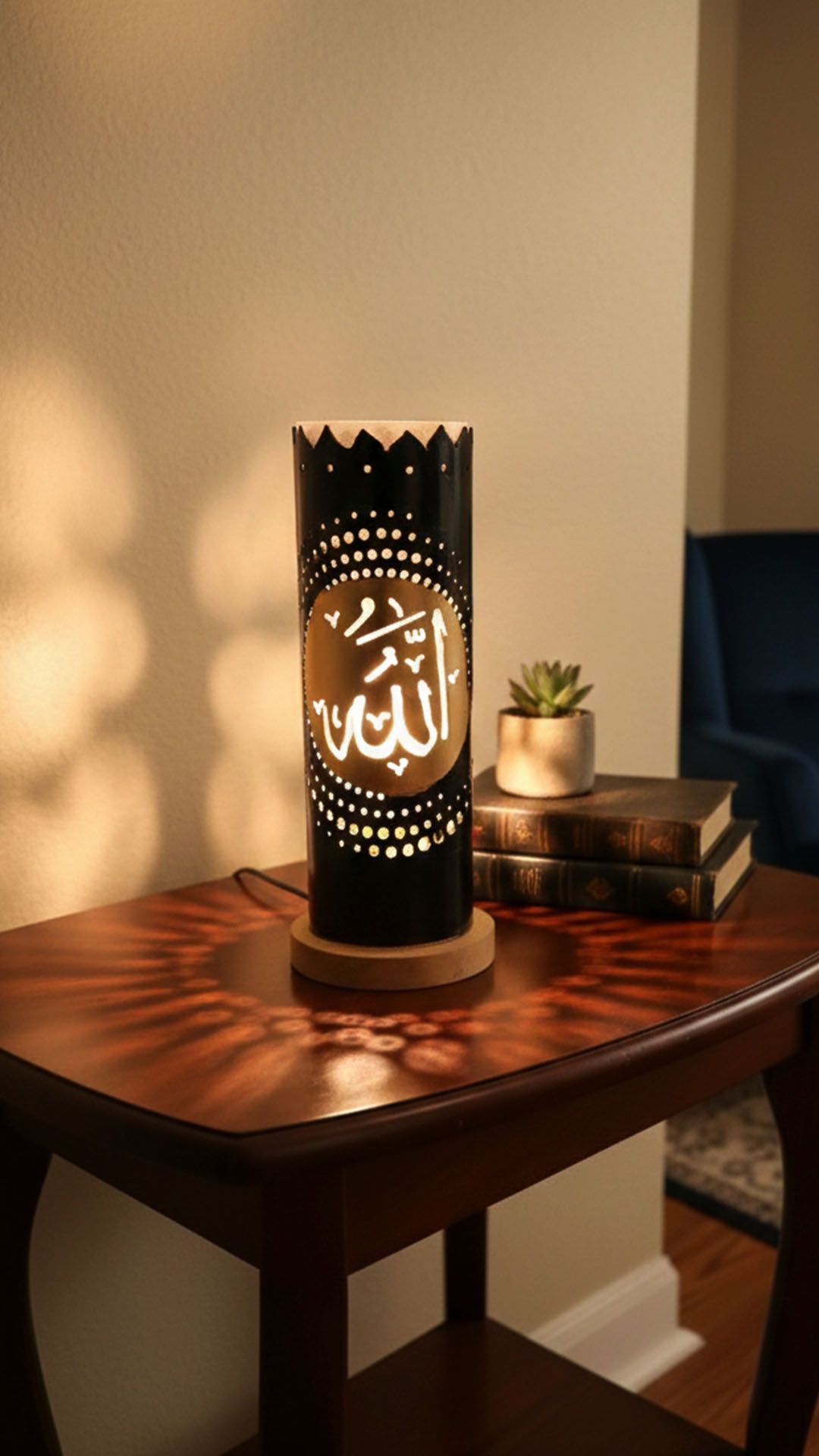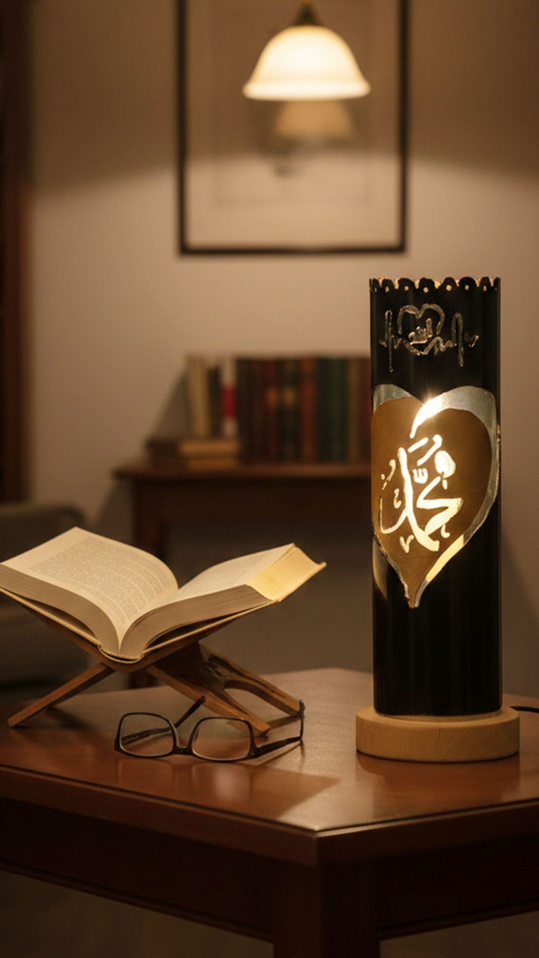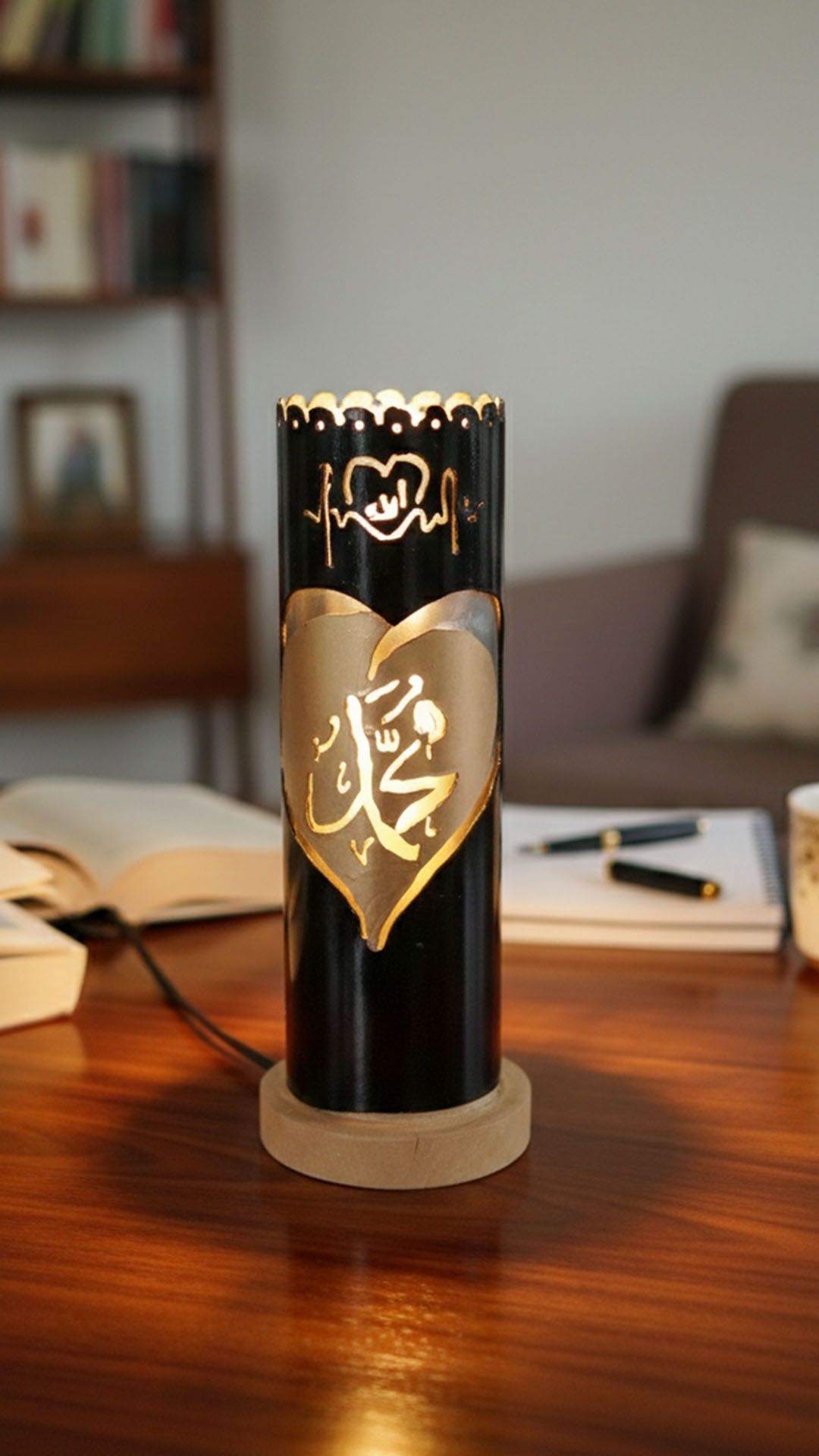 We have brought a beautiful Islamic design LED table lamp to enhance the beauty and spiritual atmosphere of the house. The name “Muhammad (PBUH)” is engraved in Arabic calligraphy in a heart shape cut design on the black metal body. When the light is turned on, a soft warm light spreads from the heart, which makes the house calm and pleasant.